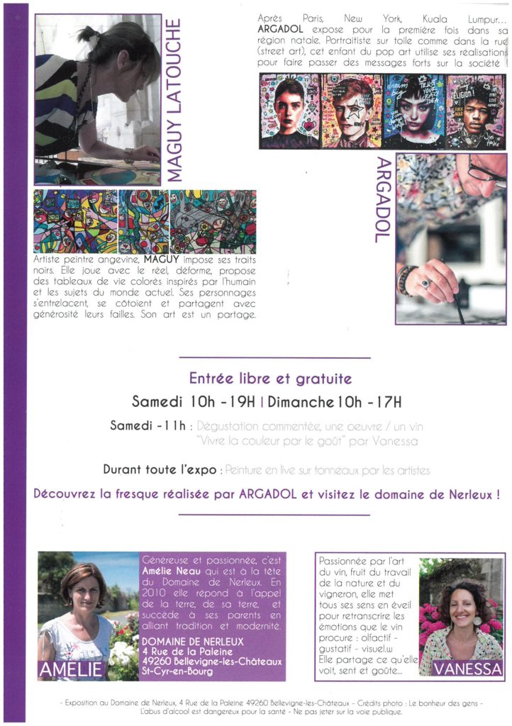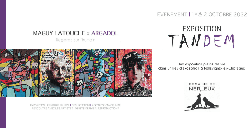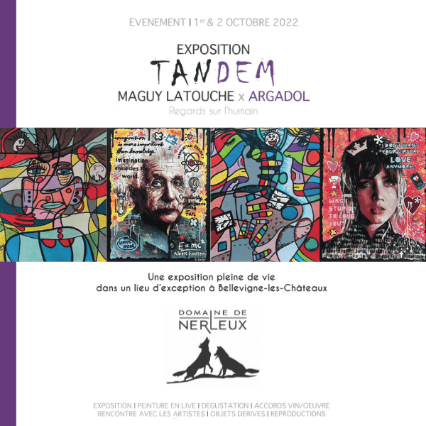 Samedi 1er et Dimanche 2 Octobre, le Domaine de Nerleux recevait pour la première fois les artistes peintres Maguy Latouche et Argadol pour leur exposition TANDEM « Regards sur l’humain ». Lors de ce weekend, ils ont su animer le Domaine et partager leurs univers colorés et pétillants à travers la présentation de toiles et d’ateliers de live painting.