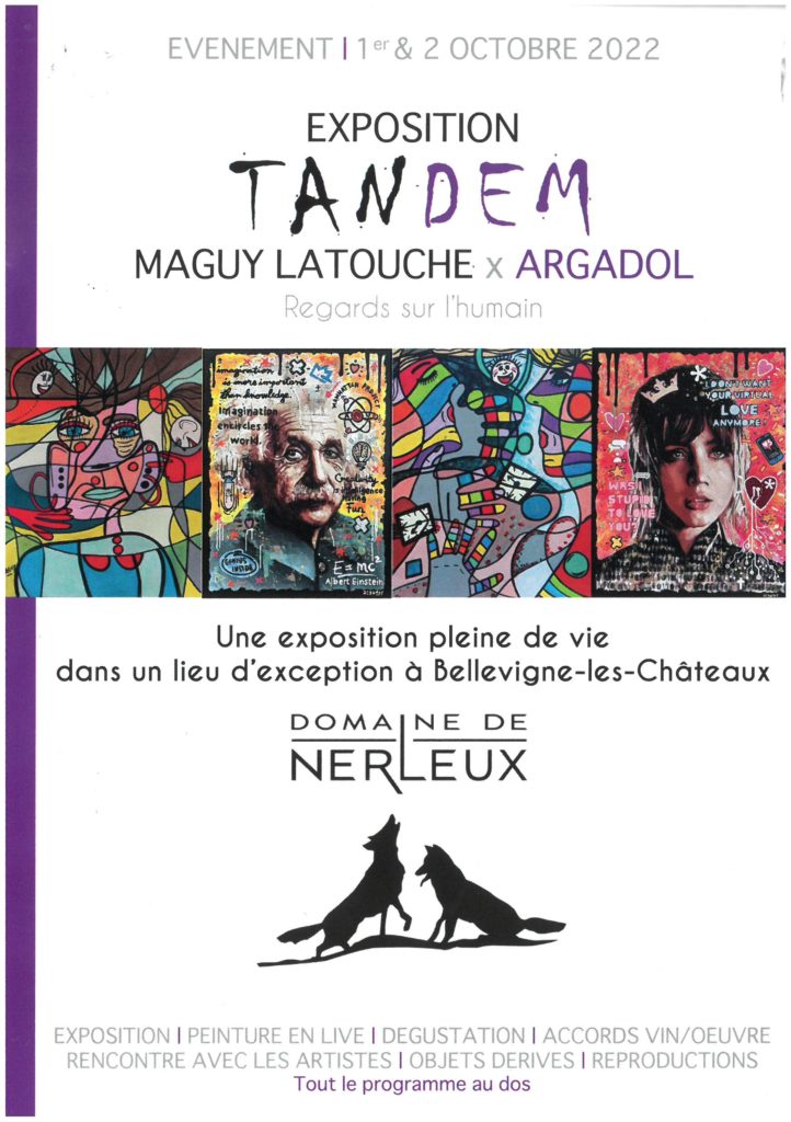 Les Samedi 1er(de 10h à 19h) et Dimanche 2 Octobre (de 10h à 17h), le Domaine de Nerleux aura le plaisir d’accueillir deux artistes peintres : Maguy Latouche et Argadol, pour une exposition unique, TANDEM « Regards sur l’humain ».