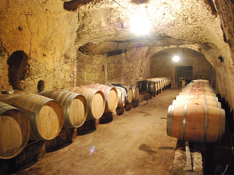 Au Domaine de Nerleux, les caves servent à la fois de lieu de stockage pour les anciens millésimes et de lieu d’élevage en barrique pour les cuvées des Loups Noirs et de la Louve α.